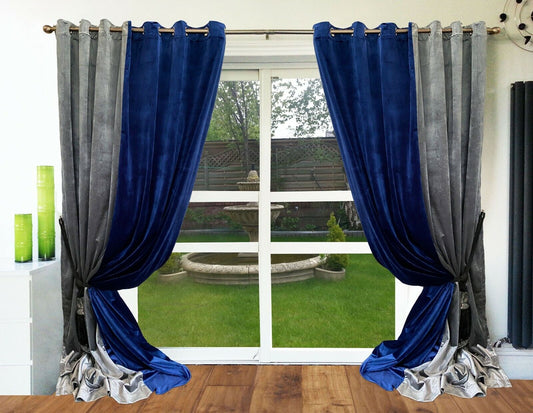 Ring Top Eyelet Curtains ITALY Plush Velvet 2 tone NAVY BLUE/grey