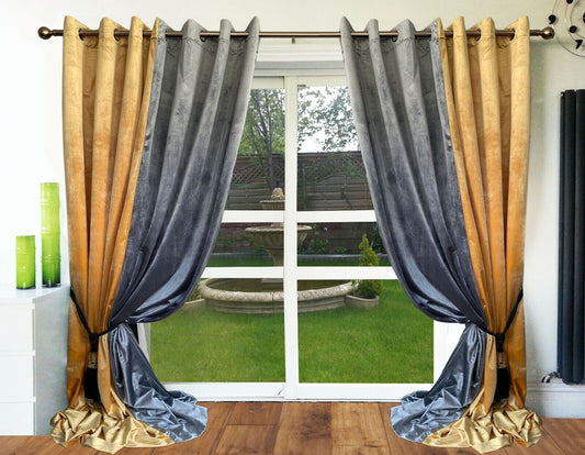 Ring Top Eyelet Curtains ITALY Plush Velvet 2 tone MUSTARD YELLOW/grey